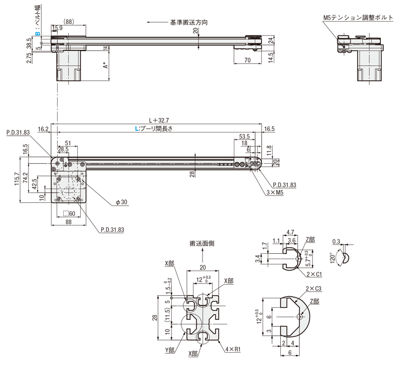 平ベルトコンベヤ モータ内蔵タイプ 2溝フレーム φ32