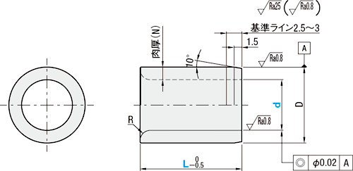| 型番 | L選択 | D | D公差 | 肉厚 (N) | R | ¥基準単価 | |||||||||||