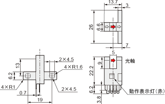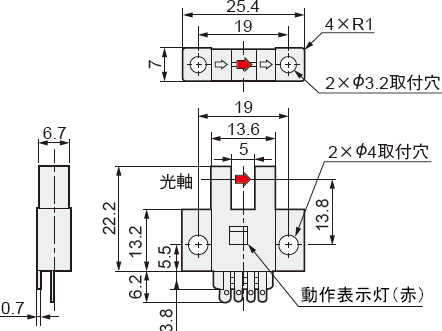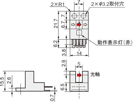 | 動作表示灯 | 橙色LED(入光時点灯) | 動作表示灯(赤)(遮光時ON/入光時ON選択可) | |