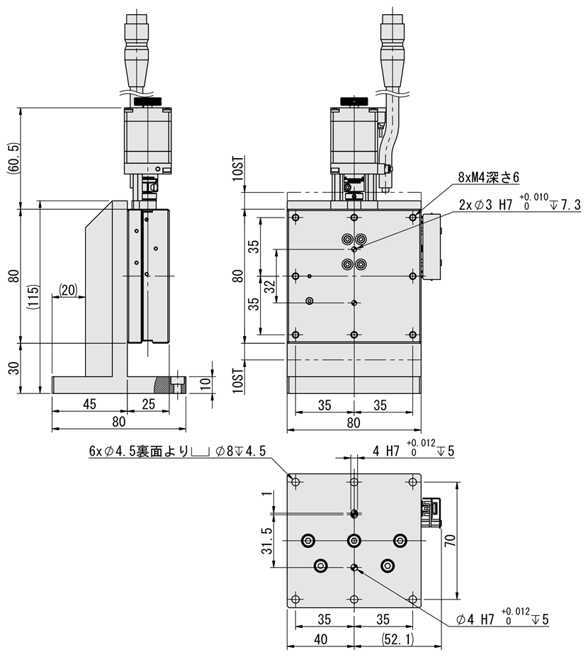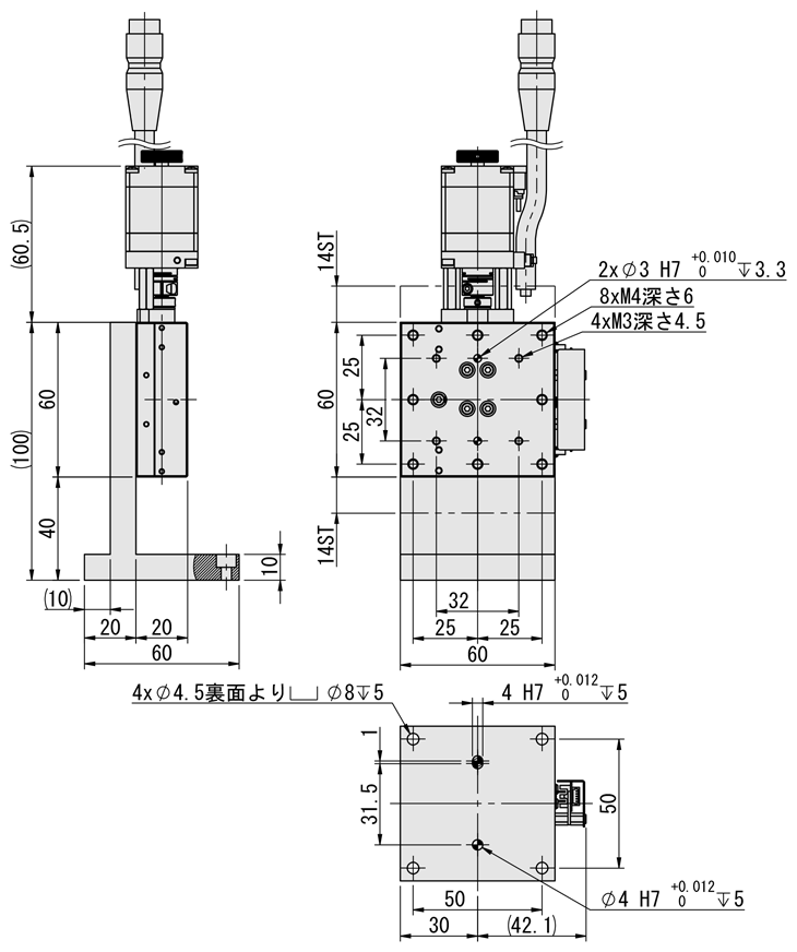 | Type | No. | ステージ面 (mm) | 移動量 (mm) | 耐荷重 (N) | 自重 (kg) | 分解能 (/パルス) | 最高速度 | 一方向 位置決め精度 | 繰返 位置決め精度 | ロスト モーション | テーブル 平行度 | 運動 直線度 | 運動 平行度 | リミット センサ | 原点センサ (ORG1) | ||||