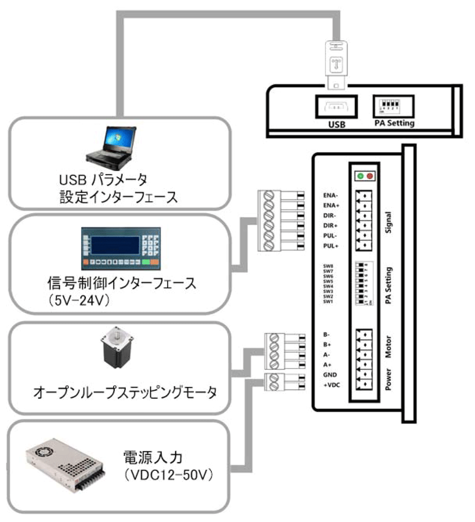 | PUL+ ステップパルス信号の正極(プラス) | 高速信号:パルス立ち上がりエッジ有効 高電位時電圧範囲:5~24Vdc、 低電位時電圧範囲:0~0.5V パルス幅:1.5μs 以上必要 |