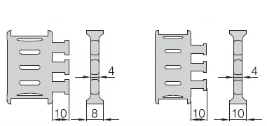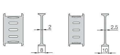 | 型式 | 外側高さ B | 内側幅 C | 外側幅 W | ピッチ P | 曲げ半径 R | リンク数 | ジョイントくし歯板 | ジョイントくし歯板数 | 仕切版 | 仕切版数 | 取付寸法(対応する曲げ半径) | 必要空間 高さHF | 質量 Kg/m | |||