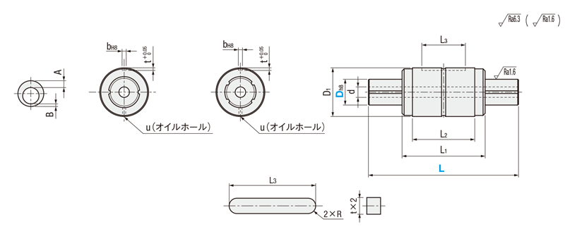 | 型番 | L 指定1mm単位 | d | D1 | L1 | L2 | L3 | bH8 | R | t | u | 偏肉 A-B | 基本定格トルク | 基本定格荷重 | 静的許容モーメント | 質量 | ||||||