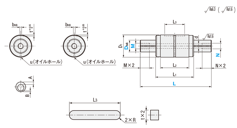 | 型番 | L 指定1mm単位 | M(並目)・N(並目) 選択 | d | D1 | L1 | L2 | L3 | bH8 | R | t | u | 偏肉 A-B | 基本定格トルク | 基本定格荷重 | 静的許容モーメント | 質量 | |||||||||