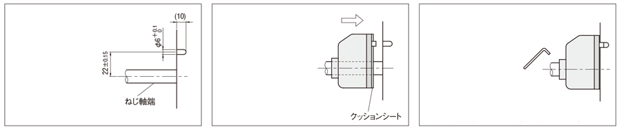 ① 位置決め用の穴を加工してください。 (クランププレートを使用される場合は、必要ありません。) ②ねじ軸に通してください。 ③ インジケータの目盛が0(ゼロ)になるよう、