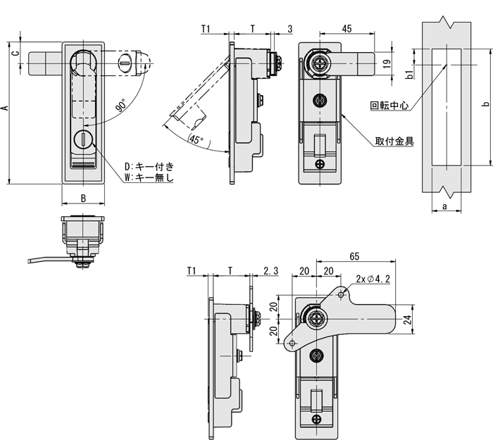 | Type | A | 鍵穴有無 | 本体色 | B | C | T | T1 | a | b | b1 | ¥基準単価 |