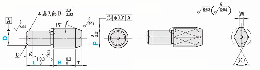 | TC | 先端テーパー部長さ変更![]() | m寸法を変更します。TC=1mm単位指定 [ ! ]B+m≧TC+2(ストレート部min.2mm) [ ! ]P≧2.00に適用 [ ! ] P/2-TC×tan15°(≒0.27)>0.5 [ ! ]TCの指定により、B寸法が変わります。