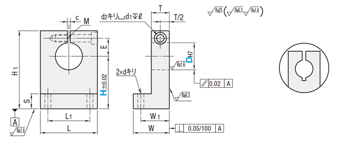 | 型式 | H | L | H1 | T | S | W | W1 | L1 | d | E | 締付ボルト M | d2 | d1 | ℓ | C | |||||||