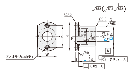 内径R 追加 ![]() | RC | 内径Rを両側に加工します。 D10→R1 D12〜26→R2 D30・35→R3 指定方法 RC [ ! ]P寸・L寸フリー指定タイプのみ適用 [ ! ](D-P)/2≦2の場合、R<2になります | 300 |