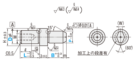 [ ! ] B+m≧TC+2 [ ! ]P/2-TC×tan15°(≒0.27)>0.5 [ ! ]TCの指定により、B寸法が変わります。 | 首元の逃げをR0.5に変更します。 指定方法 RC [ ! ] H-P≧2の場合に適用 [ NG ] LAC併用不可 | 六角穴を加工します。指定方法 RAC