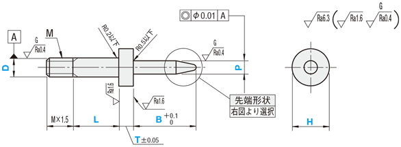 | 型式 | D | D寸 公差 | L 指定0.5mm単位 | P 指定0.1mm単位 | P寸 公差 | B 指定0.5mm単位 | H 指定0.1mm単位 | T 指定0.5mm単位 | E 指定0.5mm単位 (テーパ形状のみ) | R | M 並目 | |||