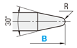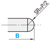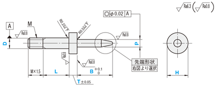 | 型式 | D | D寸 公差 | L 指定0.1mm単位 | P 指定0.01mm単位 | P寸 公差 | B 指定0.1mm単位 | H 指定0.1mm単位 | T 指定0.1mm単位 | (E) 指定0.5mm単位 (テーパ形状のみ) | R | M (並目) | |||