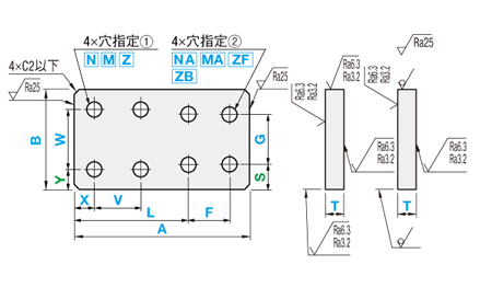 | 加工 仕様 | タップ有効長最大 M・MA×2 [ ! ]T≧M・MA×3のとき、 タップ下穴が貫通しない 場合があります。 |