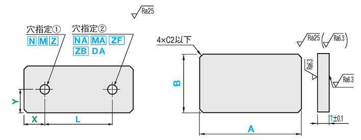 | 型式 | − | A | − | B | − | T | − | X | − | Y | − | 穴指定① | − | L | − | 穴指定② | − | (CC) | ||