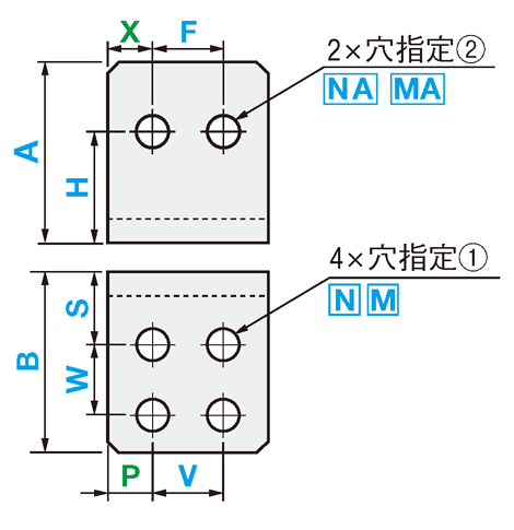 | 型式 | 外形寸法 | P | V | S | W | 穴指定① | X | H | F | 穴指定② | ||||||