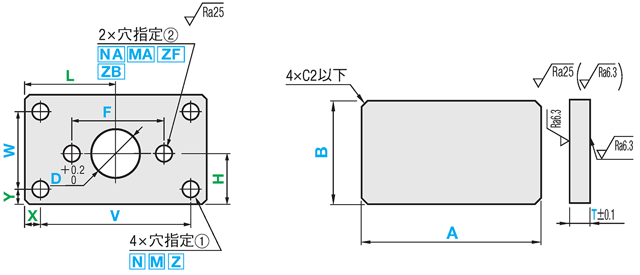| 加工 仕様 | タップ有効長 最大M・MA×2 [ ! ]T≧M・MA×3のとき、 タップ下穴が貫通しない 場合があります。 |