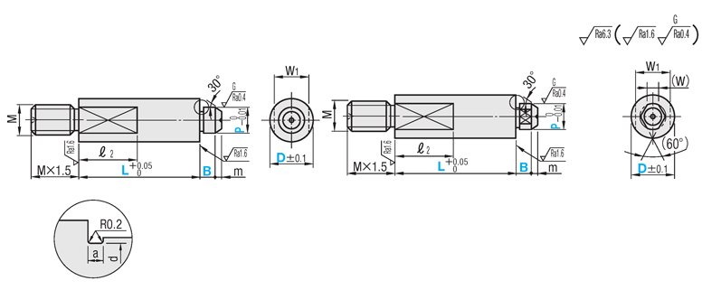 | 型式 | L 指定0.01mm単位 | P 指定0.01mm単位 | B 選択 | m | M (並目) | *締付トルク N・cm | W1 | (W) | ℓ2 | ||