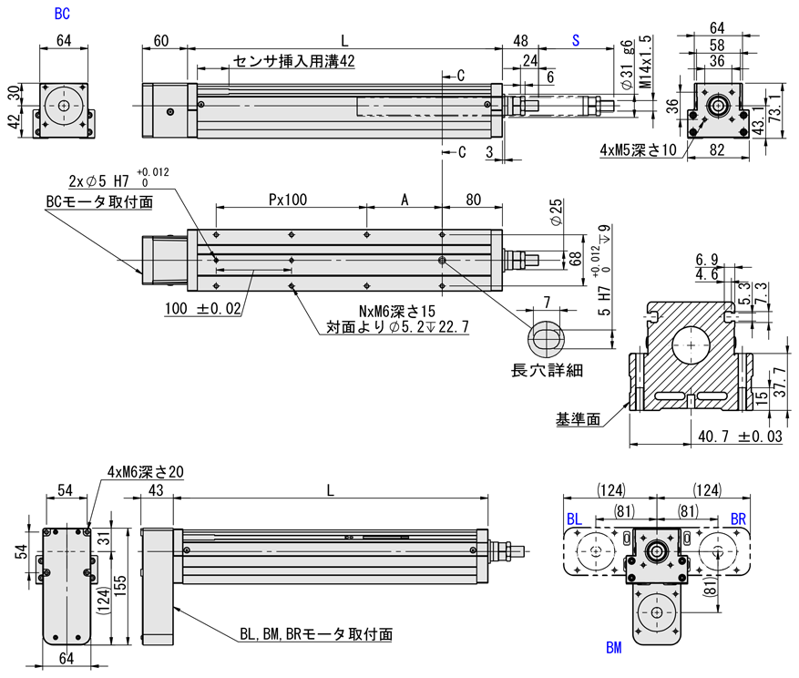 C-C断面拡大図 S=2 : 5| 構成部品 | 本体 | 内蔵ガイドレール | スライダー | プッシュロッド | モータ取付板 |