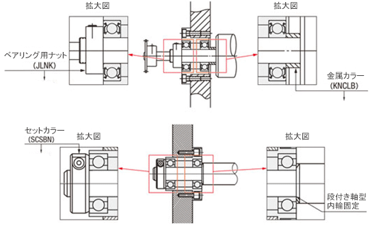 | 止め輪付きベアリングハウジングの止め輪は、軸方向に締め付けることはできず、ベアリングの脱落防止のみの役割です。 ベアリングを軸方向に固定する必要がある場合は、固定リングやナットなどの使用を推奨します。 また、軸方向固定用の固定リングやナットなどを選定する際は、止め輪を避けてください。 止め輪の寸法は製品仕様をご参照ください。 | ![]() |