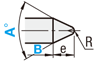 | [ ! ]センター穴が残ります。 [ ! ]P-2Etan(A/2)≧0.73 [ ! ]P-2Etan(A/2)≧2(ディコート®) | [ ! ]センター穴が残ります。 [ ! ]e=P/2÷tan(A/2)+R-{R÷sin(A/2)} |