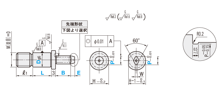 治具用位置決めピン 並級ツバなしタイプ 先端形状選択おねじタイプ