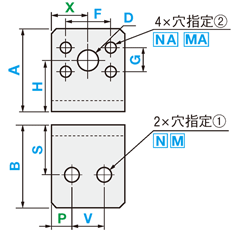 | 型式 | 外形寸法 | P | V | S | 穴指定① | X | H | F | G | D | 穴指定② | ||||||