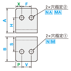 | 型式 | 外形寸法 | P | V | S | 穴指定① | X | H | F | 穴指定② | ||||||