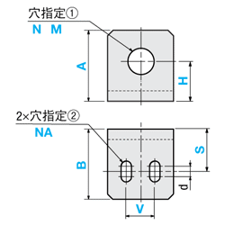 | T | N・NA(ボルト通し穴) | M(タップ穴) |