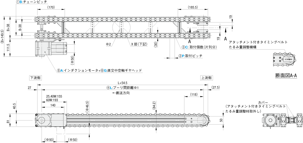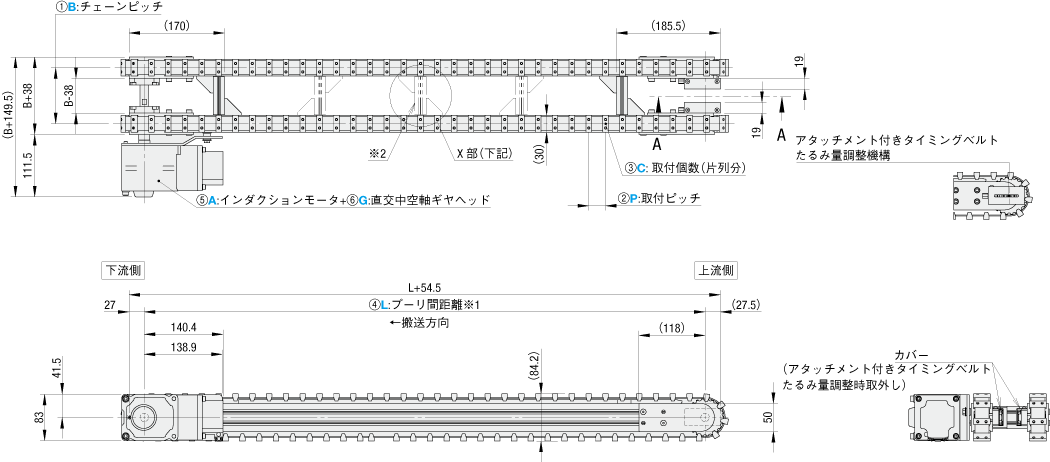 型式 | ベルト種類 | ①B (チェーンピッチ) | アタッチ仕様 | ④L (プーリ間距離) [mm] | モータ選択 | ||||||