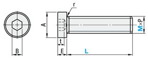| 型式 | M×P | 頭部径 A | 頭部高さ E | 六角穴幅 B | 六角穴深さ t max. | 不完全ねじ部 (e)max. | 首下 r | ||