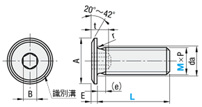 | 型式 | M×P | 頭部径 A | 頭部高さ E | 六角穴幅 B | 六角穴深さ t max. | 不完全ねじ部 (e)max. | 首下 r | 首下 da max. | ||