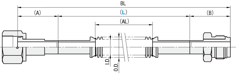 | 型式 | L | 適用チューブサイズ | A | B | AL | BL | I.D. | O.D. | 板厚 | 最小曲げ半径 | VCR継手 (インチ) | ¥基準単価 | |||