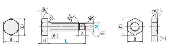 | 型式 | L 選択 | M×Pitch | B | (C) | H | (ℓ1) | (r) | Z | d | SR1 | ナット寸法 T(並目) | ||||||||