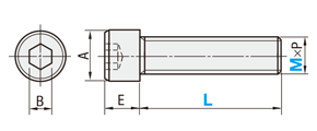 | 型式 | 頭部径 A | 頭部高さ E | 六角穴幅 B | ピッチ P | ||