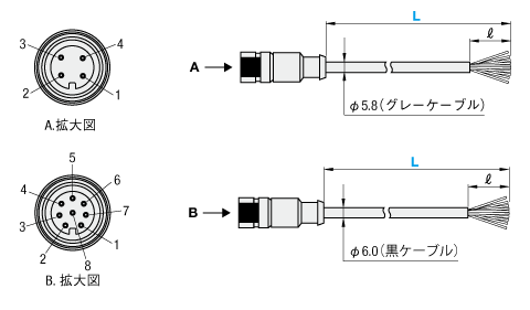 | 構成部品 | 4芯シールドケーブル(外径5.8mm、灰色) | 8芯シールドケーブル(黒色・外径5.8mm) | |