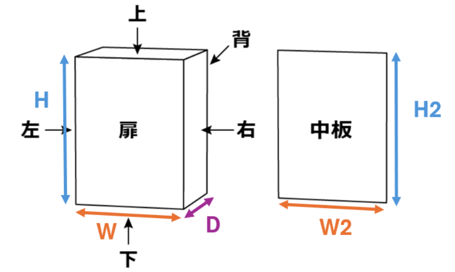 | ※1 黒矢印は面の矢視方向を示しています ※2 色矢印は外形寸法を示しています ※3 中板は扉を開け内側から見た矢視方向です ![]() | ![]() |