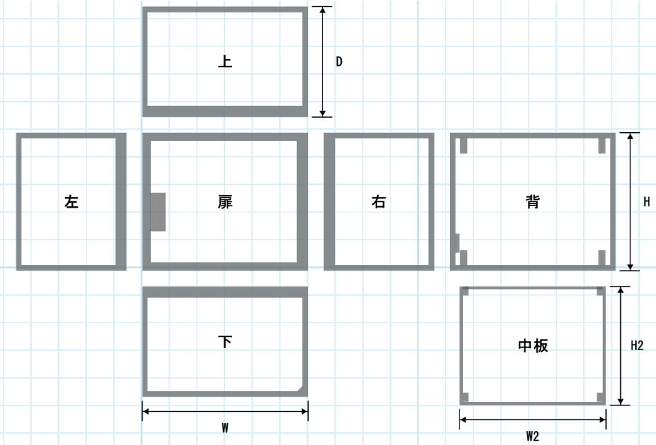 | 加工面はすべて外から見た図となります。 | 中板は扉を開けて正面側から見た図面となります。 グレーの範囲は加工指定ができません。 ※図はあくまで一例です。外寸により加工不可領域は異なります。 |