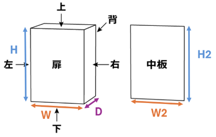 | ※1 黒矢印は面の矢視方向を示しています ※2 色矢印は外形寸法を示しています ※3 中板は扉を開け内側から見た矢視方向です ![]() | ![]() |