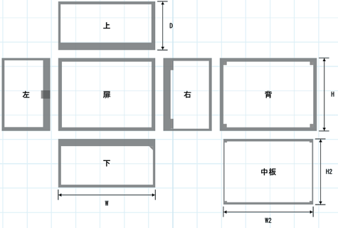 | 加工面はすべて外から見た図となります。 | 中板は扉を開けて正面側から見た図面となります。 グレーの範囲は加工指定ができません。 ※図はあくまで一例です。外寸により加工不可領域は異なります。 |