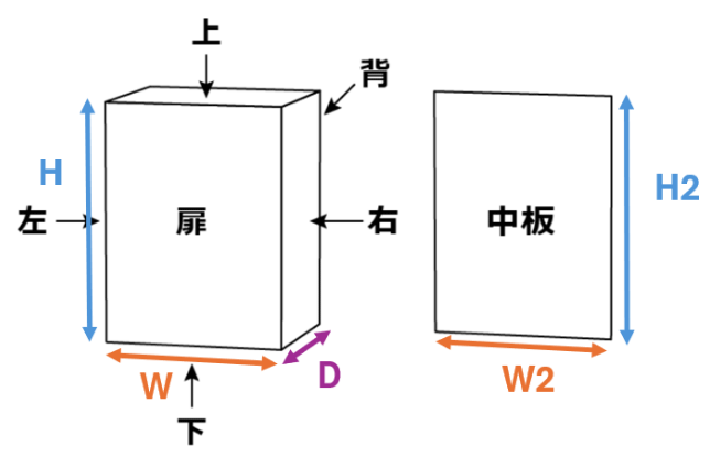 | ※1 黒矢印は面の矢視方向を示しています ※2 色矢印は外形寸法を示しています ※3 中板は扉を開け内側から見た矢視方向です ![]() | ![]() |