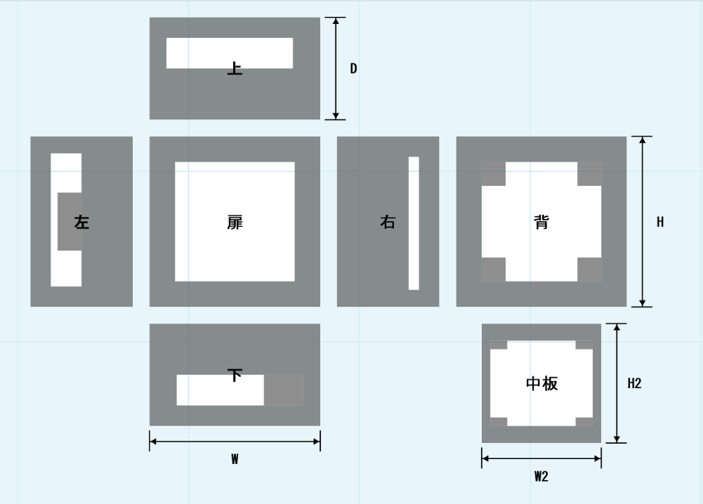 | 加工面はすべて外から見た図となります。 | 中板は扉を開けて正面側から見た図面となります。 グレーの範囲は加工指定ができません。 ※図はあくまで一例です。外寸により加工不可領域は異なります。 |