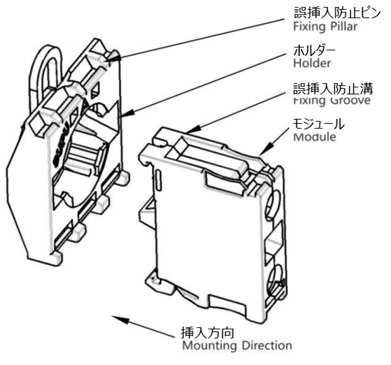 ステップ1:モジュールを取り付ける際は、モジュール側の誤挿入防止溝を中座側の誤挿入防止ピンに合わせてください。