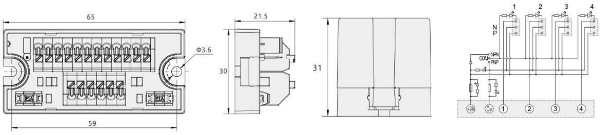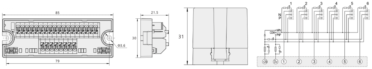 | E-INT-TB6P3X4-CA | 65 | 30 | 21.5 | 31 | 1.5 | 16 | -40-80℃ | 20%-85% | プッシュイン | CE,RoHS | TB | 6 | 3X4 | DC24 | 1 | 52 |