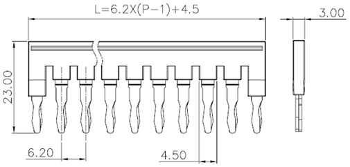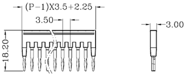| 型式 | 長さ (mm) | 幅 (mm) | 高さ (mm) | 重さ (g) | 定格電流 (A) | 適合端子台厚み (mm) | ピン間隔 (mm) | 極数 | 「おすすめ」 ブロック端子台 | 「おすすめ」 エンドプレート | 「おすすめ」銘鈑類 |