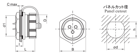 | 型式 | 属性 | サイズ | 重量 | パネルカット径 | 芯数 | 定格電圧 | 定格電流 | 温度範囲 | 脱着方法 | 接線方法 | 挿抜 耐久性 | 絶縁抵抗 | 接触抵抗 | 導線線径 | 材質 | 認証 | 適合レセプタクル | ||||||||