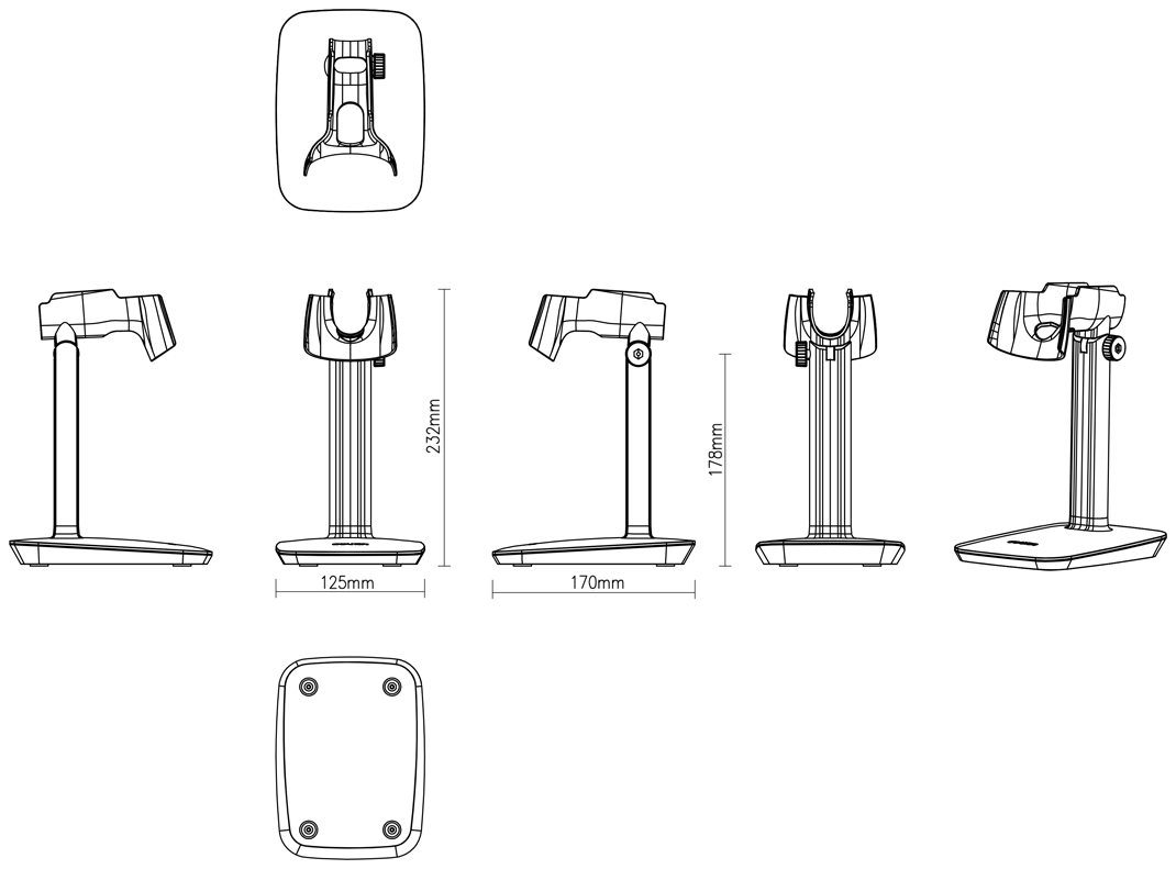 ハンディタイプの専用コードリーダースタンド。組み込みが簡単、机に据え置き可能。
