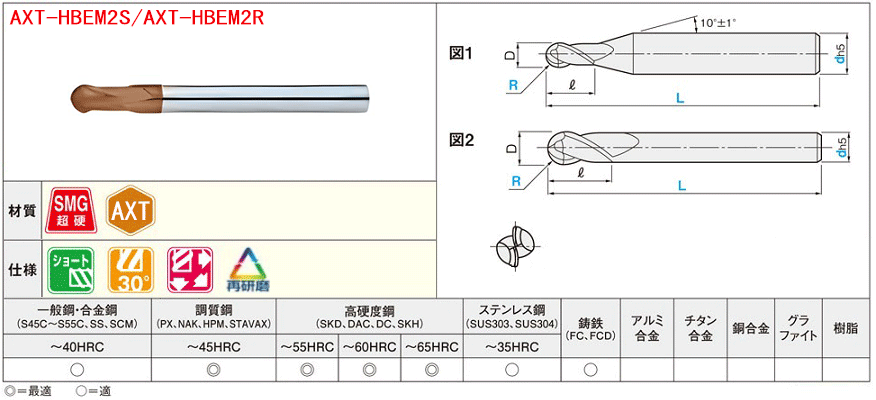 AXTシリーズ超硬ボールエンドミル 調質鋼・高硬度鋼用 2枚刃/レギュラータイプ
