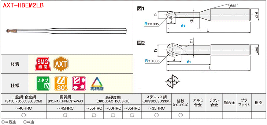 AXTシリーズ超硬ロングネックボールエンドミル 調質鋼・高硬度鋼用 2枚刃