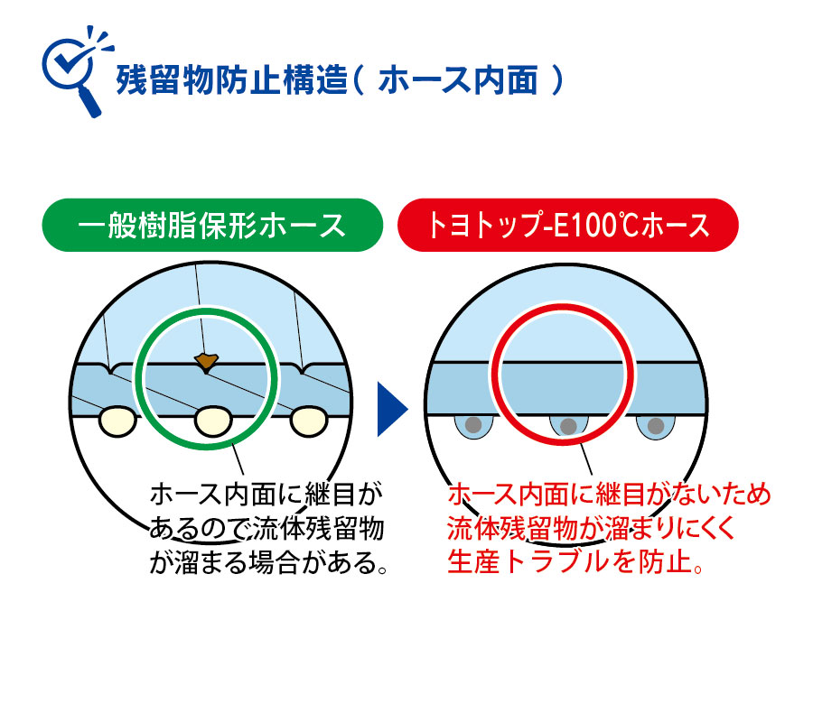 【安定搬送】ホース内面に継ぎ目がなく平滑なので、プラスチック粉、流体残留物が残りにくい