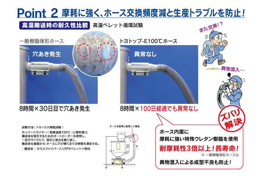 【耐摩耗ホース】 優れた耐摩耗性によりホースの穴あきを防ぎ、ホース片やアース線(銅線)の混入による成形不良を防止